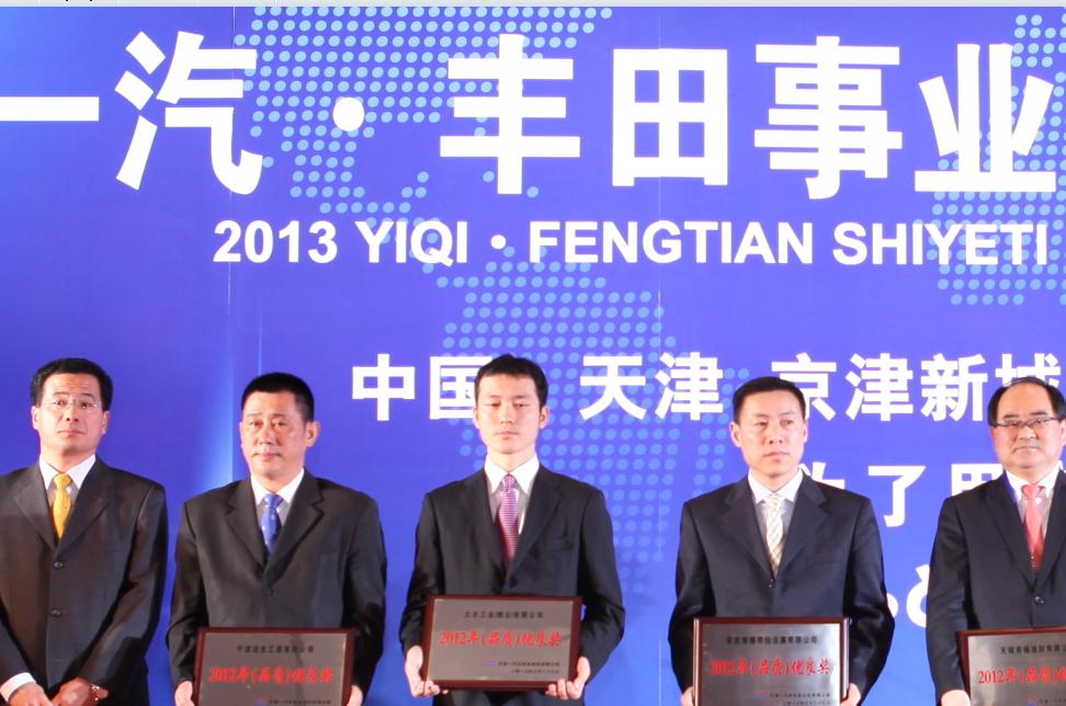 2013年3月29日,內藤靖之部長代表TCY參加了在天津舉行的2013年度一汽豐田集團供應商大會。會中與TFTE延時部長,金井副部長,SFTM加藤增經理以及TTCC寺町副總經理進行友好會晤。在會后的供應商表彰大會中,我司獲得天津一汽豐田發動機有限公司和一汽豐田(長春)發動機有限公司兩家公司的“2012年度品質優良獎”。這代表著一汽豐田集團的兩家主機廠對我司2012年度的質量管理以及售后服務的充分肯定和嘉許。