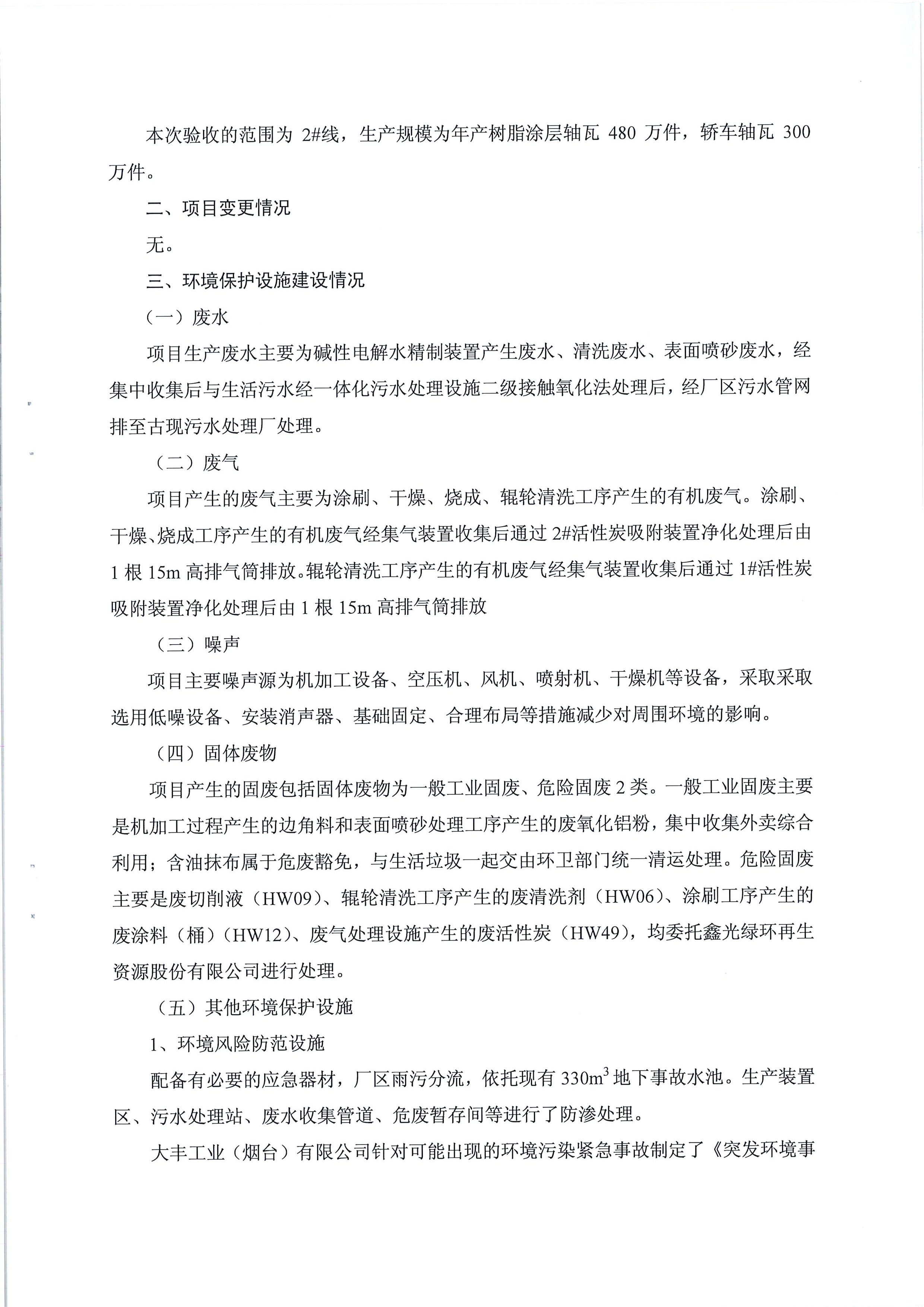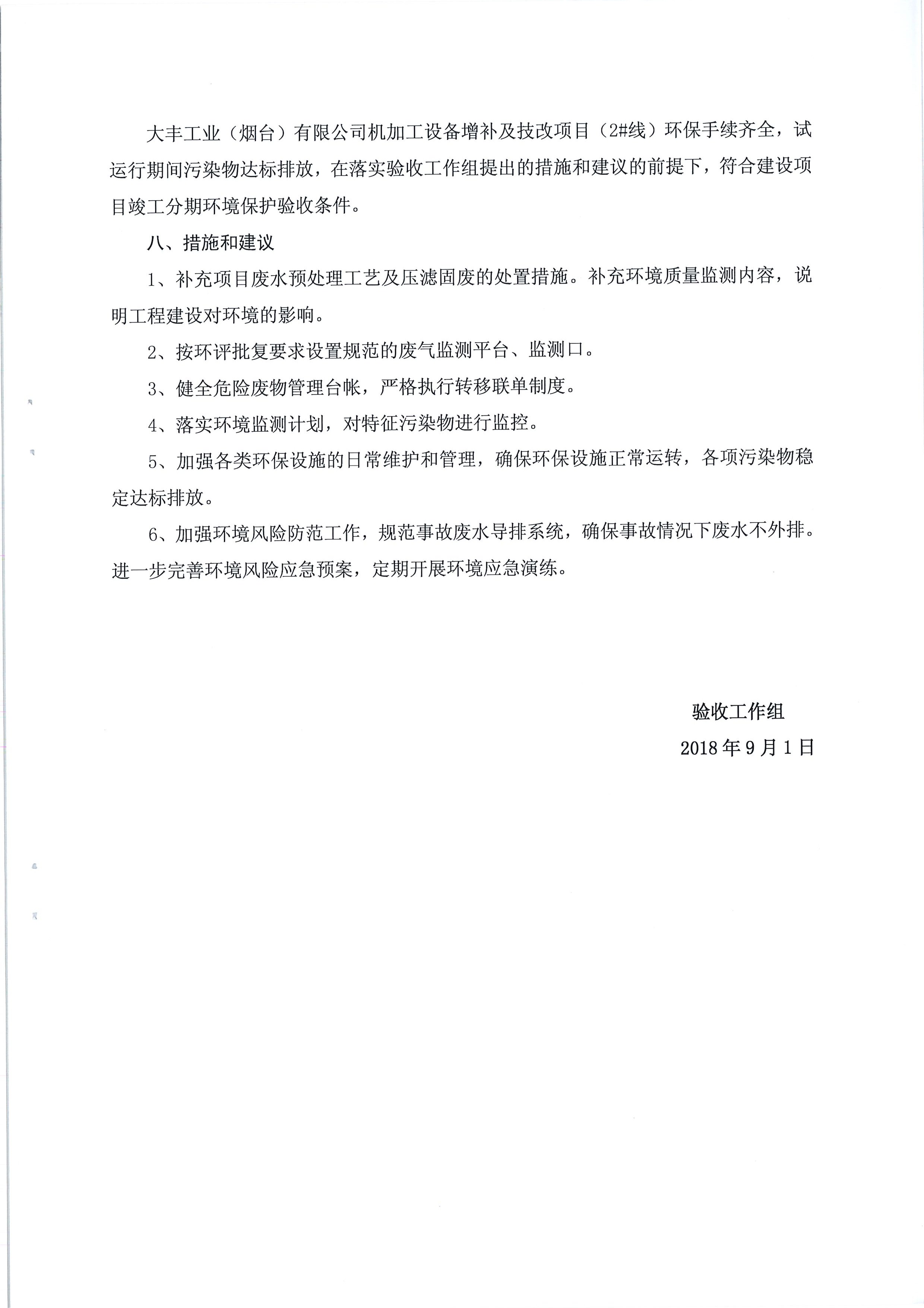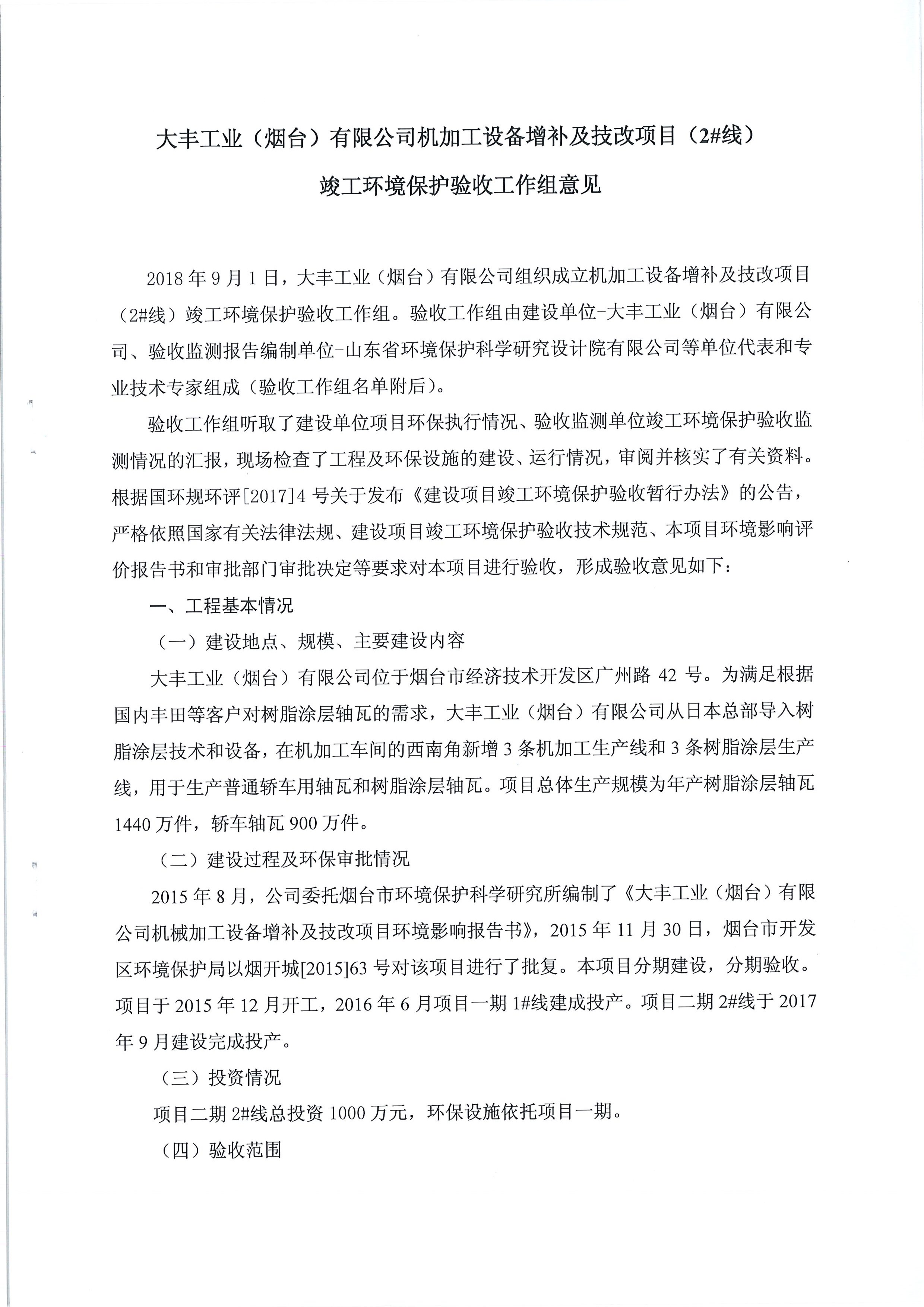 大豐工業(yè)(煙臺)有限公司機加工設備增補及技改項目(2#線)竣工環(huán)境保護驗收工作組意見