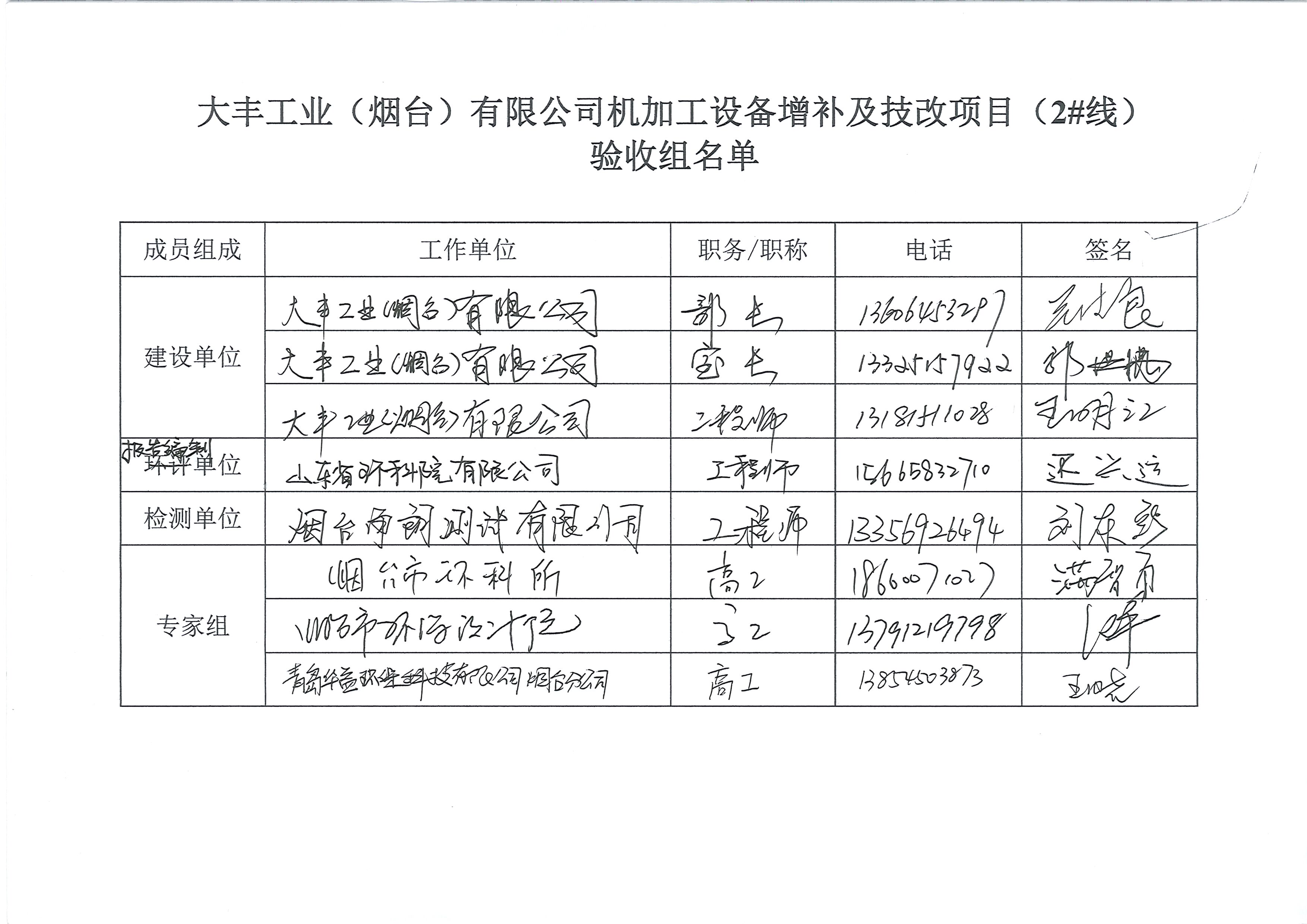 大豐工業(煙臺)有限公司機加工設備增補及技改項目(2#線)驗收組名單